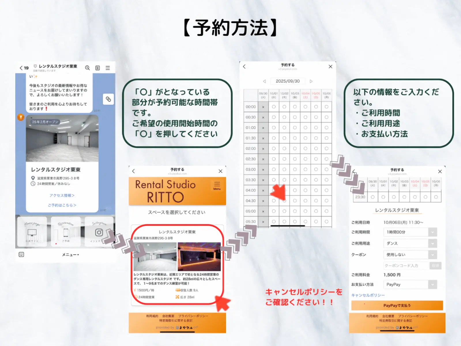 レンタルダンススタジオ栗東では、どなたでも簡単にご利用いただけるシンプルな手順をご用意しています。
