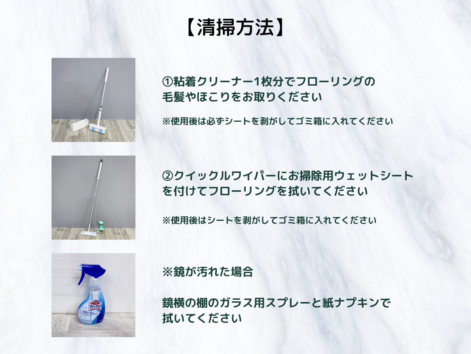 鏡や床に汚れがあれば、備え付けのクリーニング用品で清掃をお願いします。